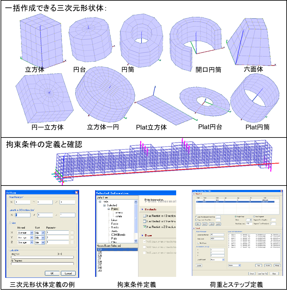 - 3次元メッシュ作成機能による、簡単な定義で3次元形状の作成