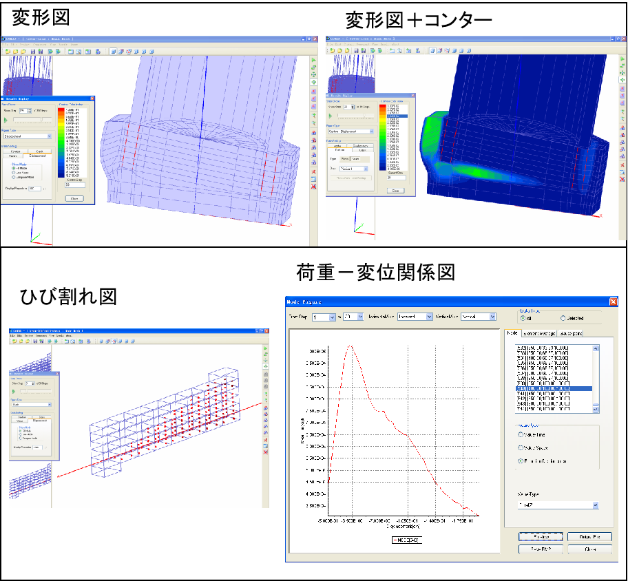 COM3D は、鉄筋コンクリート非線形解析プログラムCOM3*に専用Pre, Post処理機能をつけたソフトで、三次元鉄筋コンクリート構造物を対象とした解析をするための非線形有限要素プログラムです。任意形状の構造物を有限要素に分割し、コンクリート、鉄筋および地盤の形状、物性を設定することができます。Re-start機能を活用することにより、施工時自重/プレストレス解析が行えます。 構造物の解析結果を3次元図化により、変移・反力、応力・ひずみ、ひび割れを項目別に取り出して、構造変形図、ひび割れ図、応力・ひずみコンター/ベクタルならびに相互関係曲線として観察/出力することができます。