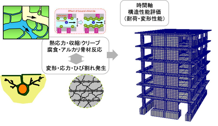 鉄筋コンクリート構造物では,微細空間で展開される材料組織形成,水分平衡・離脱,水和反応プロセスと,内部応力発生,変形,破壊進展等の機械特性を直に連成させて,材料・構造の力学特性を予測する体系の構築を目指している。巨視的に観察される時間依存変形・破壊現象を,材料内部の熱力学状態量と直結させて評価するものである。極低温から沸点近傍の温度範囲下のもと,オングストローム~マイクロメートルにまたがって分布する空隙中の水分凝縮,吸着,半結晶水の脱着と,液相-気相-氷相の3相平衡・移動現象をモデル化し,各々の特性に起因する力学的挙動を数量化することで,凍結融解作用下での部材損傷,若材齢ならびに硬化無機材料の収縮・クリープ現象の予測を試みている。これらの挙動を再現するために開発されたCOM3D-LINKが非線形力学解析COM3Dと材料解析DuCOMを一体化にした連成解析プログラムである。